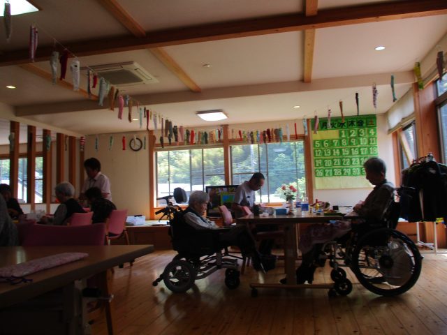 型を使い布に線を引くAさん、布をはさみで切るBさん、布を貼り合わせるCさんというように役割分担をすることでとても手際よくたくさんのこいのぼりが出来あがりました。みなさんとても楽しそうに和やかな雰囲気です(*^_^*)