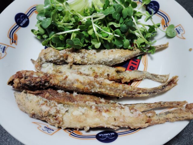 ①ししゃもを爪楊枝で所々に穴を開ける(※揚げると膨張するからとの事)。