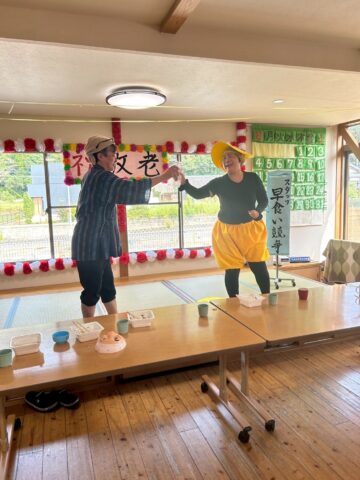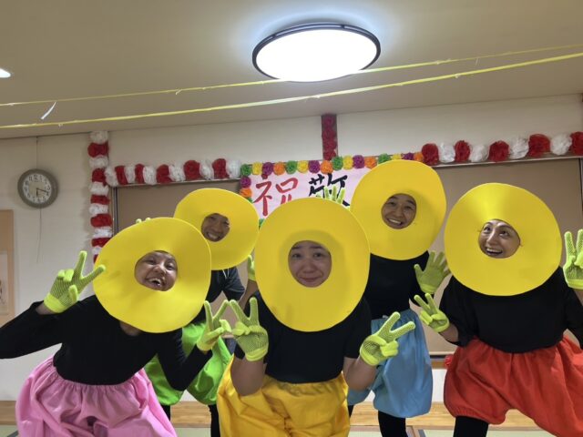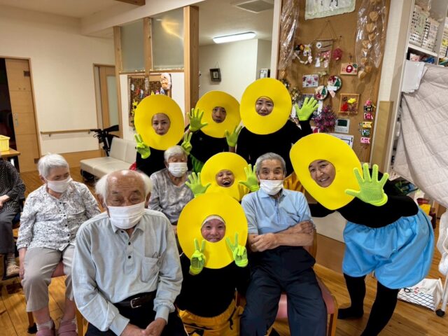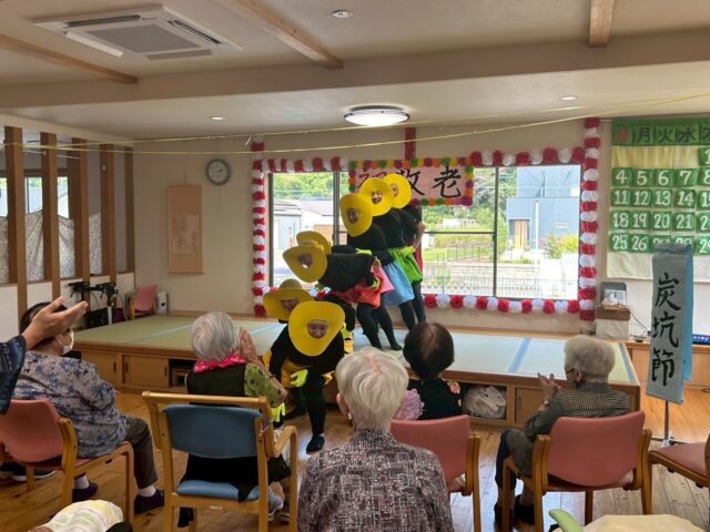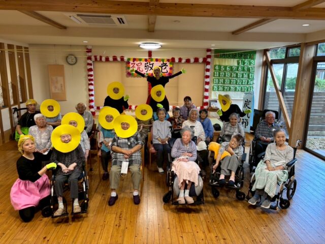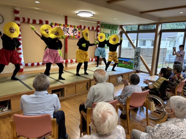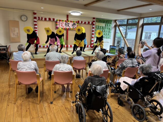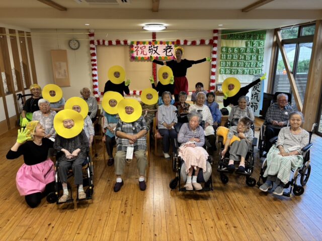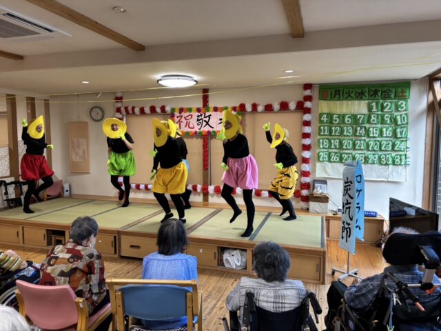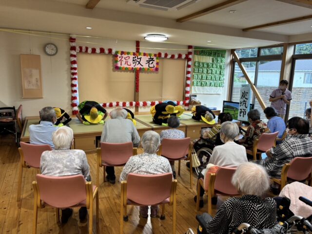 初秋の候、残暑ありながらも秋の始まりを感じさせる季節となりました🍂🍂🍂🐿 みなさんも夏の暑さの疲れが体調に出る頃ではないでしょうか?体調管理気をつけて下さいね。 さて9月と言えば一番大切な行事!「敬老の日」があります。敬老の日とは長年社会に貢献してきた老人を敬愛し、長寿を祝う日だそうです。 そこで今年も桂では感染症を考慮しつつ、小規模ながらも二日間にわたり敬老会を開催しました。 「今年はないとね~「」 「一番楽しみにしてるよ~」という利用者様からの声も多く、私達職員もその言葉に答えたいという思いで、みんなで催し物を考えた結果❕ プログラム1番~職員による炭坑節 ↓↓↓↓↓